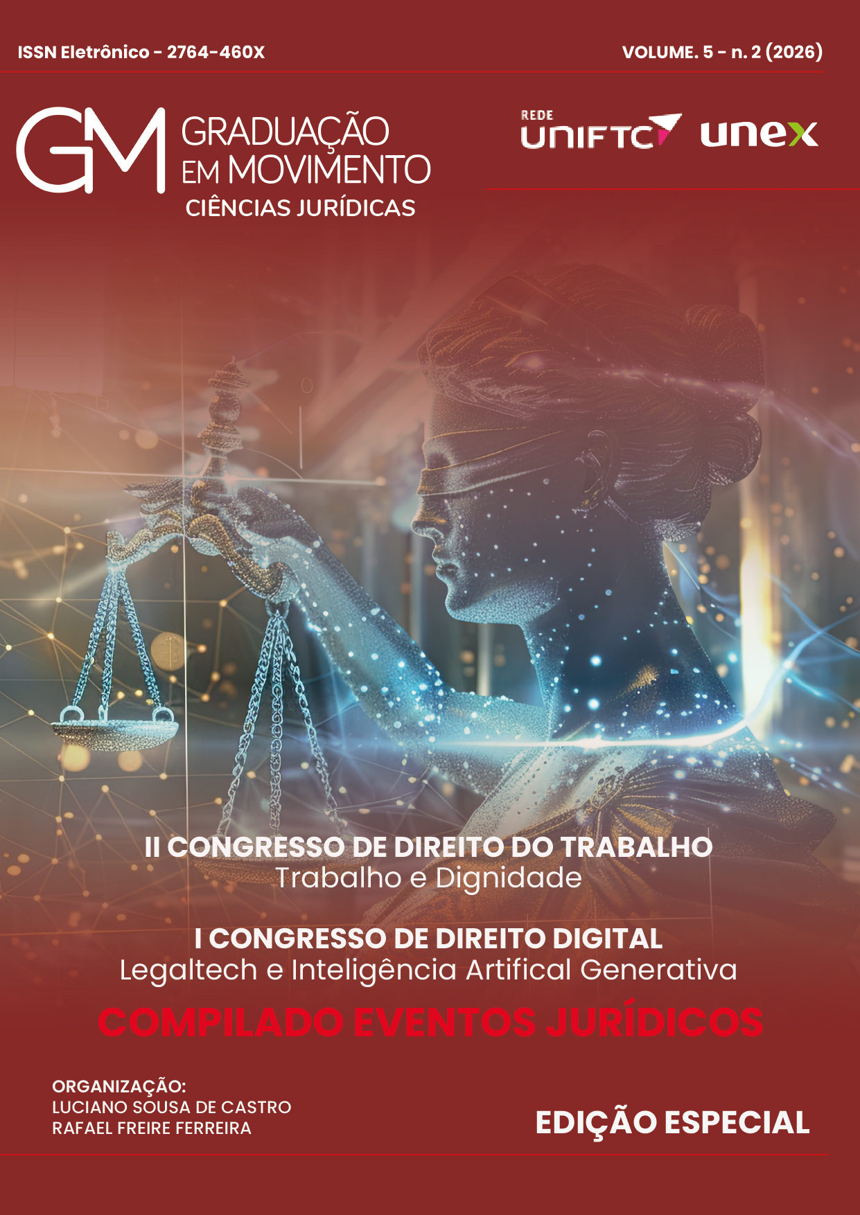 Apresentamos ao público acadêmico a Edição Especial da Revista Graduação em Movimento – Ciências Jurídicas, dedicada à compilação dos resumos científicos apresentados no II Congresso de Direito do Trabalho – Trabalho e Dignidade e no I Congresso de Direito Digital – Legaltech e Inteligência Artificial Generativa, eventos que marcaram, de forma indelével, o debate jurídico contemporâneo em 2025.